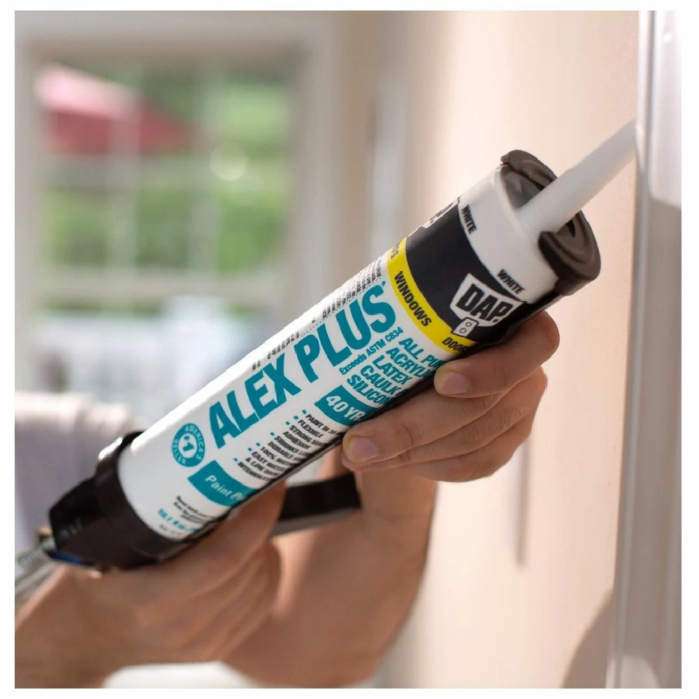 DAP Alex Plus Acrylic Latex Caulk Plus Silicone is an excellent quality, all purpose caulk for sealing a wide variety of interior and exterior surfaces. It contains silicone additives for greater flexibility and adhesion and less shrink for a durable, waterproof seal. Alex Plus is paintable in just 30 minutes with latex or oil-based paints, saving time. It won’t shine through or discolor the paint for superior paint finish results. It is easy to apply and tool, low in odor and cleans up easily with water. Cured caulk is mold and mildew resistant. Exceeds ASTM C834. Interior/exterior use.
