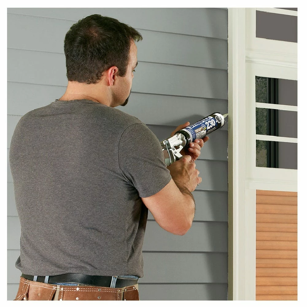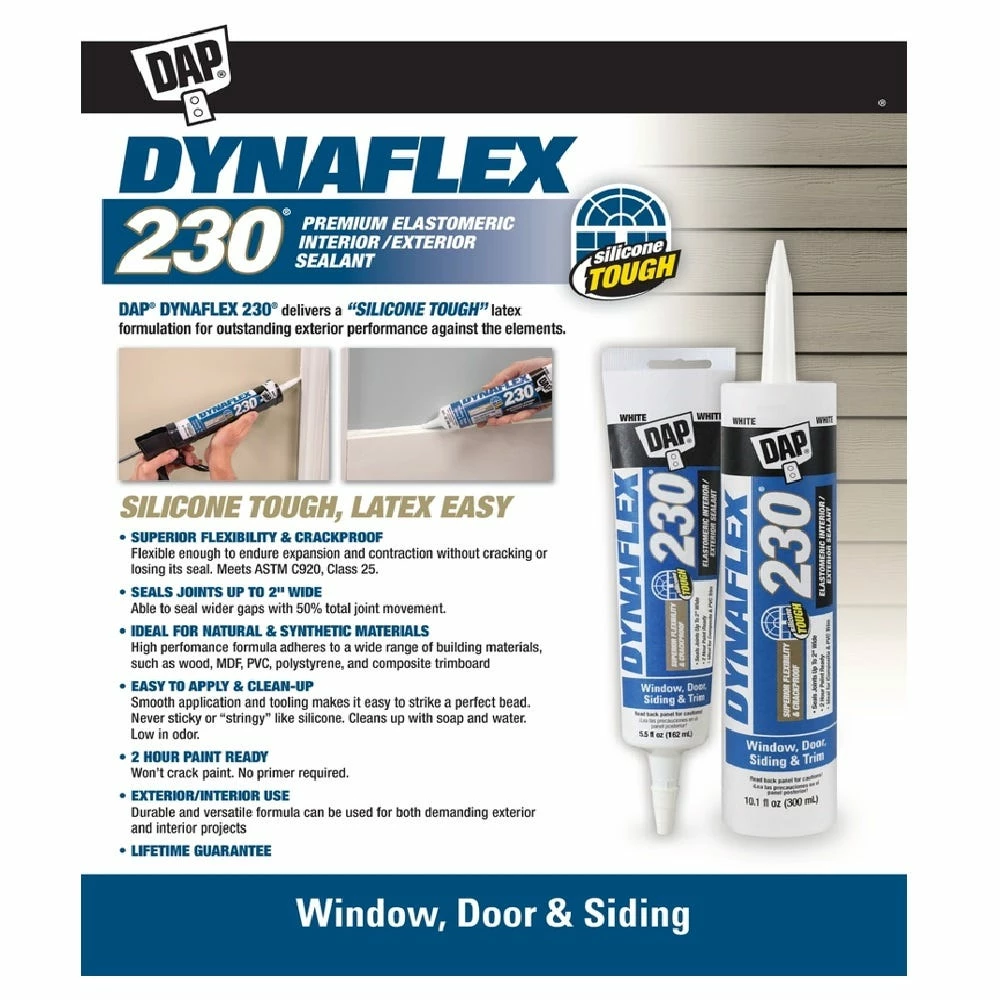 DAP Dynaflex 230 is a premium elastomeric latex sealant with silicone-like toughness. It combines outstanding durability, adhesion and flexibility with easy tooling, paintability, low odor & water clean-up. It is highly flexible to handle joint movement caused by variations in temperature and humidity without cracking. It provides a long-lasting, durable seal that is 100% waterproof and weatherproof. Ideal for sealing air leaks around windows, doors, siding, trim and baseboards to improve the energy efficiency of a home and reduce utility costs. Cured sealant is mold and mildew resistant. Meets ASTM Specification C920, Class 25. VOC compliant. Interior/exterior use.