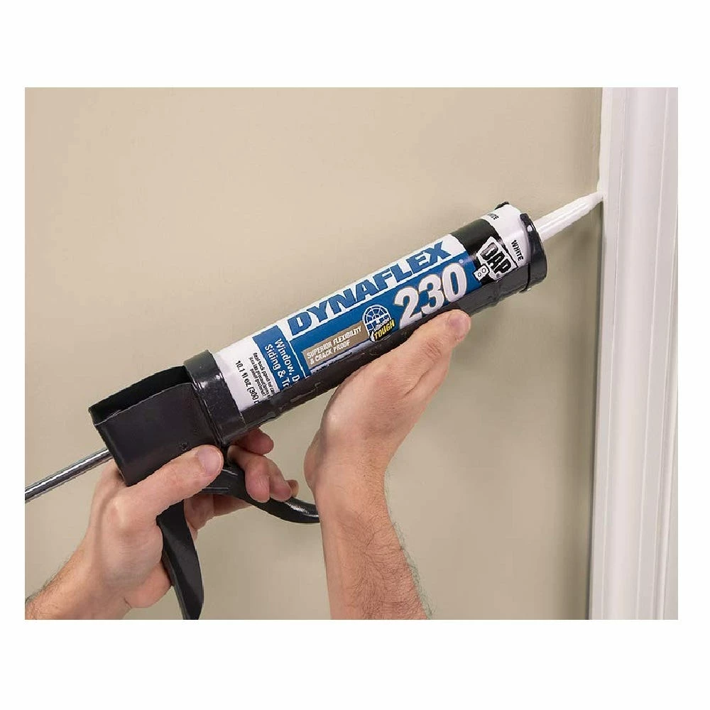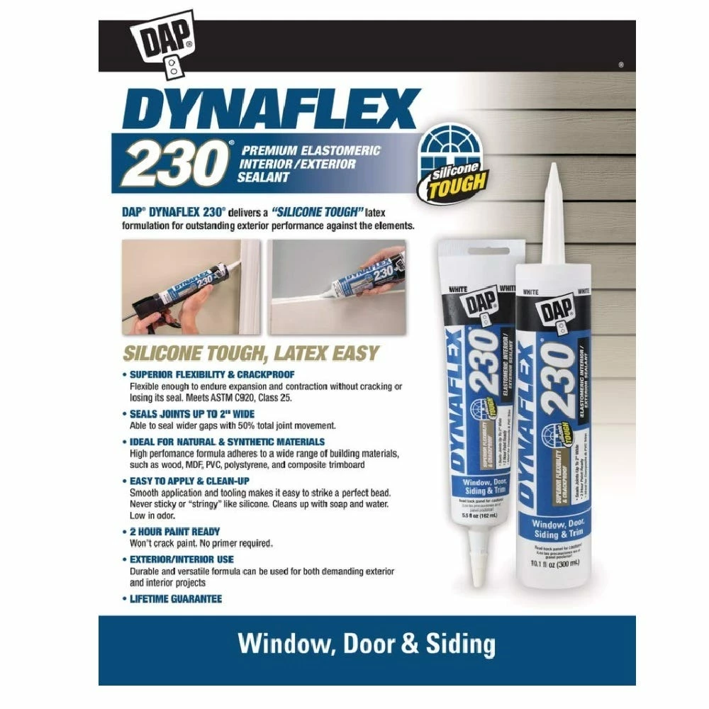 DAP DYNAFLEX 230 100% waterproof window, door, siding and trim sealant is a premium elastomeric sealant with silicone like toughness to withstand the elements. Combines outstanding durability, adhesion and flexibility with easy tooling, paintability, low odor and water clean-up. Highly flexible to handle joint movement without cracking, crumbling or losing adhesionIdeal for sealing around window and door frames, siding and trim both inside and out.
