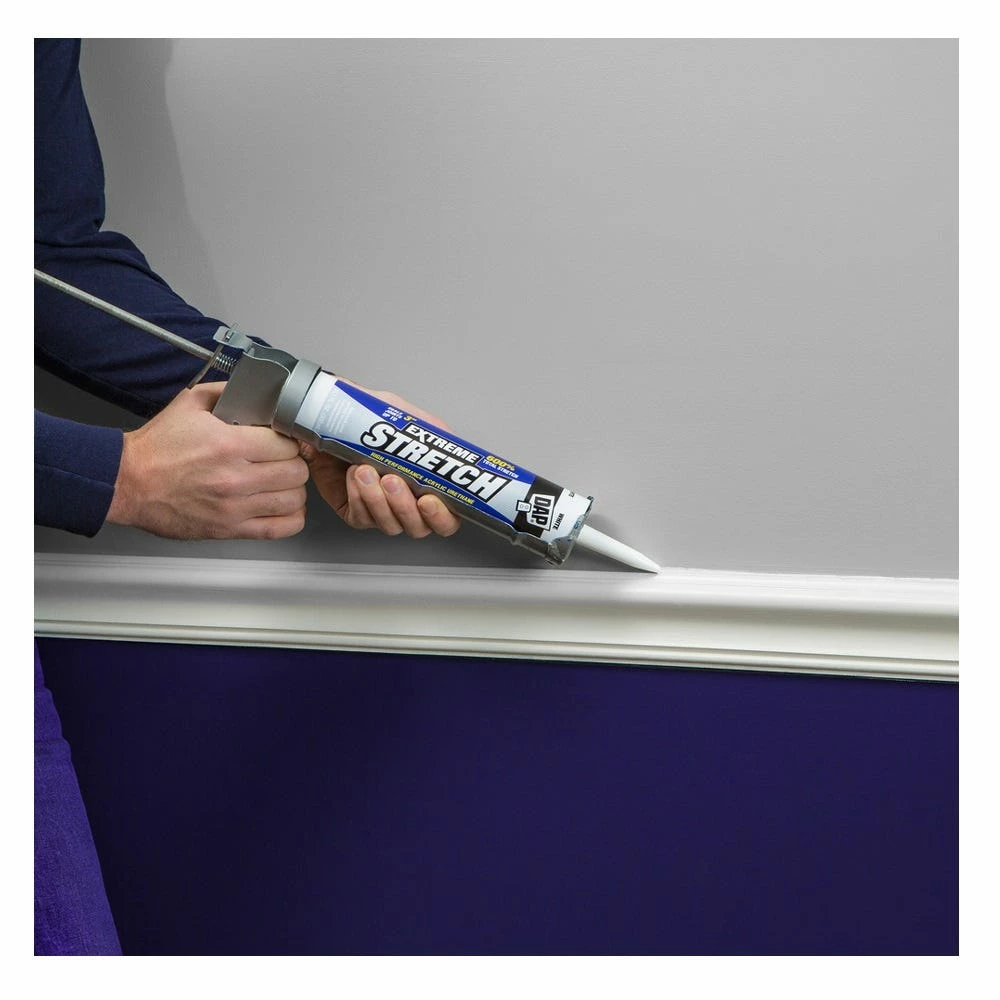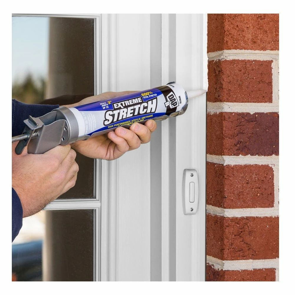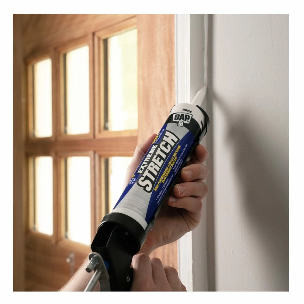 DAP Extreme Stretch Acrylic Urethane is a versatile, premium elastomeric sealant ideal for sealing a wide range of interior and exterior applications. Extreme Stretch sealant stretches over 600%, seals gaps up to 3” wide and provides superior adhesion for a long lasting, crackproof seal. Its unique acrylic urethane formula is 100% waterproof, easy to apply and tool, paintable, low odor and water clean-up. Lifetime Guarantee. Meets ASTM C920, Class 25. VOC compliant. Interior/exterior.