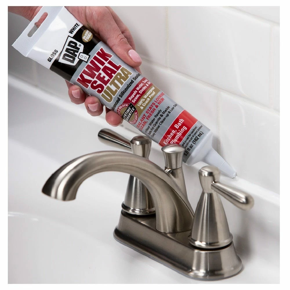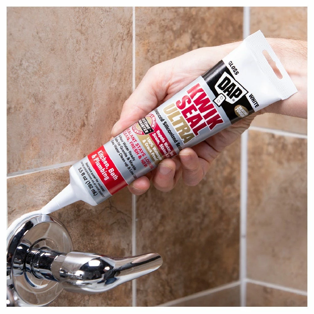 DAP Kwik Seal Ultra Advanced Kitchen & Bath Sealant is formulated with innovative ultra-hydrophobic technology that repels water, dirt and stains and offers a lifetime mold and mildew resistance guarantee so the sealant stays looking clean, fresh and new. It is 100% waterproof and crackproof and can be exposed to water in as little as 4 hours after application without washing out. KWIK SEAL ULTRA has strong multi-surface adhesion and excellent flexibility for long lasting durability. Safe for granite and marble. The easy-to-use formula applies easily, tools smoothly, is low in odor and cleans up with water. Interior use.