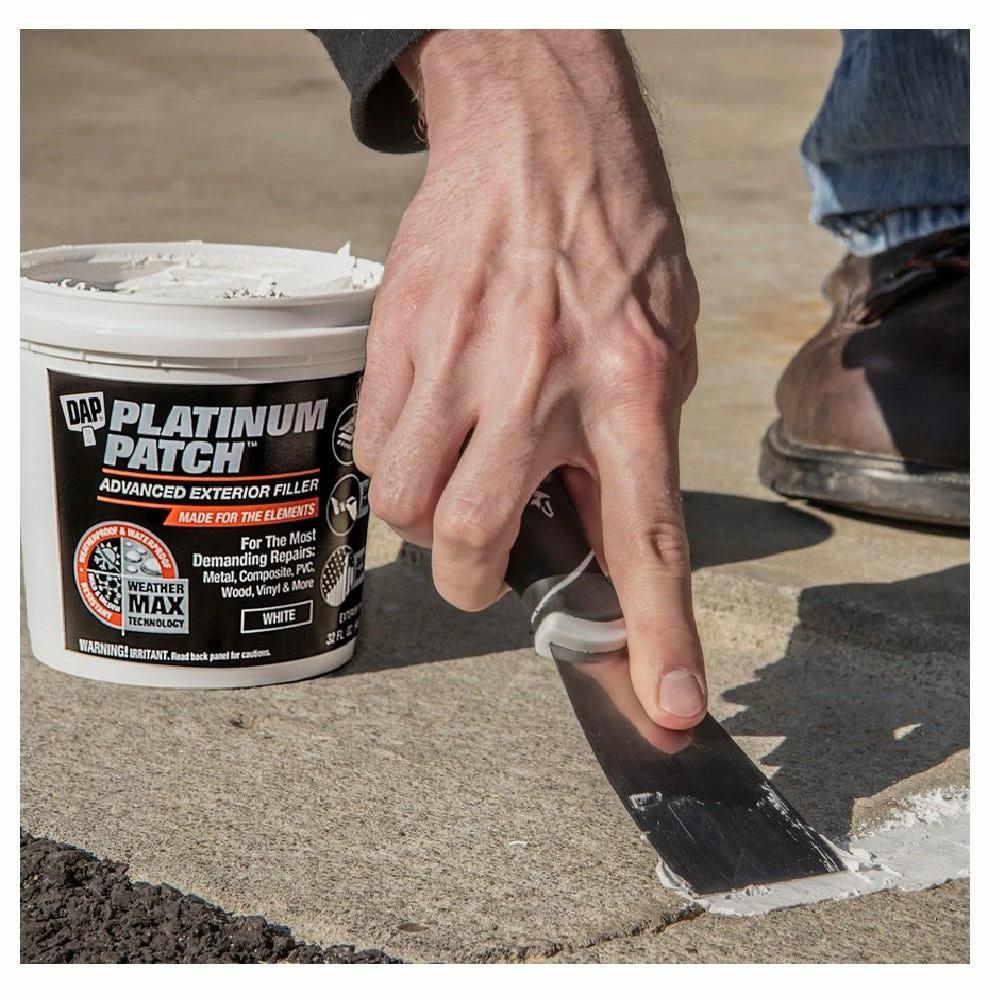 DAP Platinum Patch Advanced Exterior Filler is formulated with innovative WEATHER MAX Technology for long-lasting, all weather protection. Platinum Patch provides exceptional weatherproof protection that prevents discoloration, cracking and crumbling. The tough hydrophobic surface provides a waterproof repair that won’t swell, soften, blister or breakdown and it is mold, mildew & algae resistant making it perfect for areas with continuous exposure to the elements. It has strong multi-material adhesion to tough porous and non-porous materials making it ideal for exterior applications such as the installation, finishing or repairing of fiber cement siding, PVC trim board, vinyl siding, metal, composite, concrete, brick, wood and more.