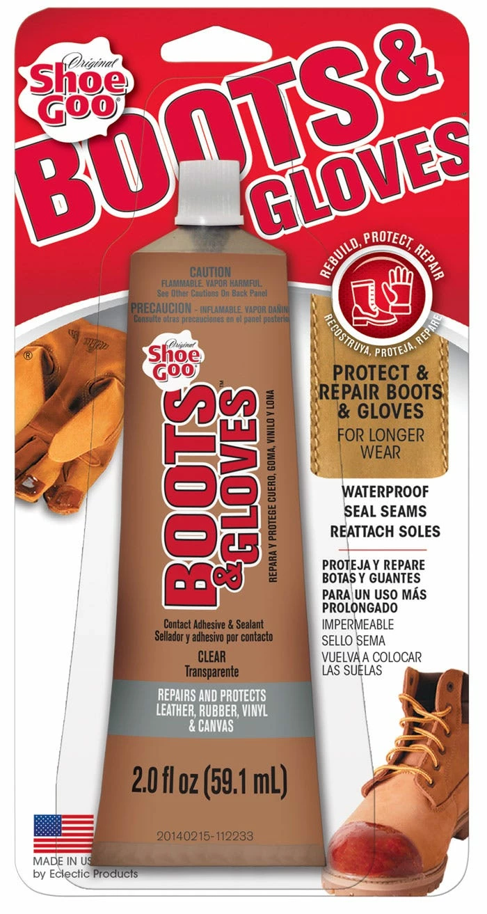 SHOE GOO Boots & Gloves provides a thick protective coating that dramatically extends the life of high wear areas on boots and gloves – even all types of sporting gloves! It also waterproofs seams and provides a permanent repair solution to most work boots or gloves.