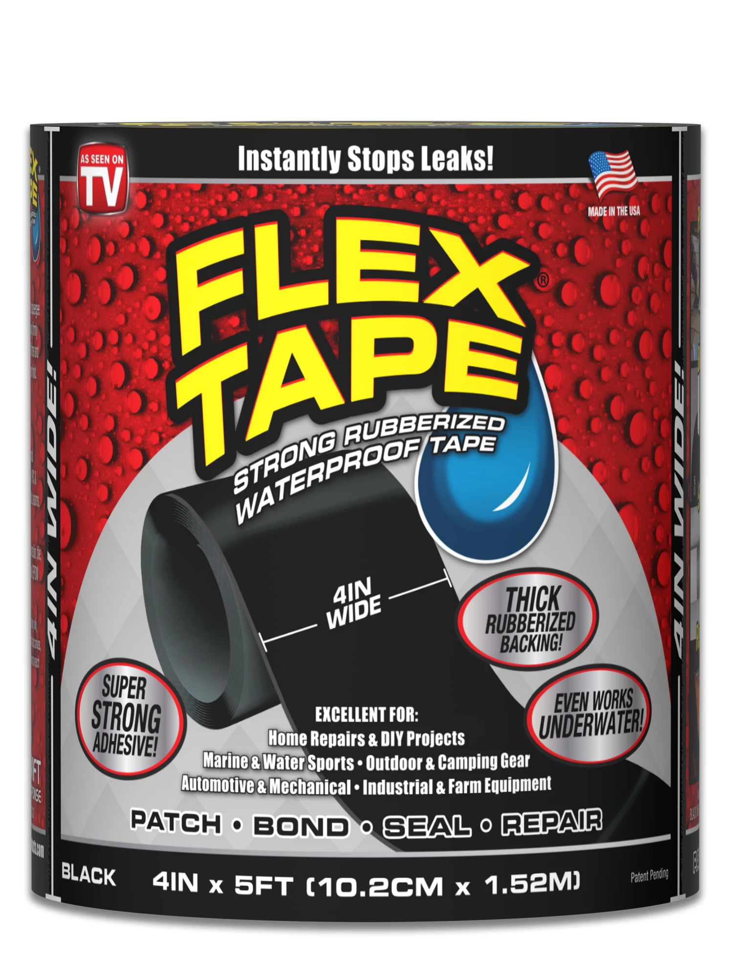 Flex Tape is a Super Strong Rubberized Waterproof Tape that creates a flexible rubberized water proof barrier. Flex Tape Instantly Seals Out Water and moisture can bond seal and patch virtually anything. It can even be applied under water and wet surfaces.