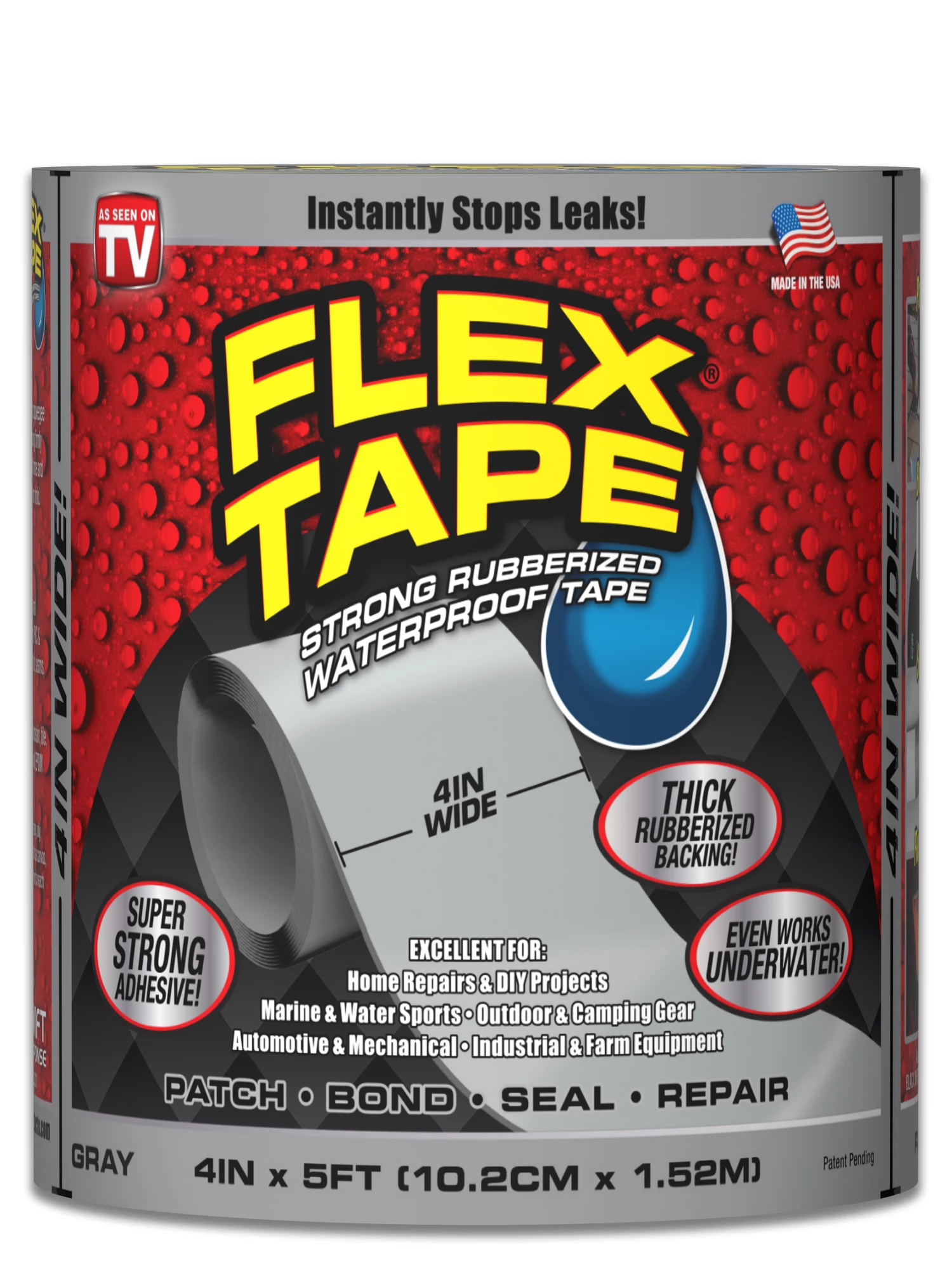 Flex Tape is a Super Strong Rubberized Waterproof Tape that creates a flexible rubberized water proof barrier. Flex Tape Instantly Seals Out Water and moisture can bond seal and patch virtually anything. It can even be applied under water and wet surfaces.