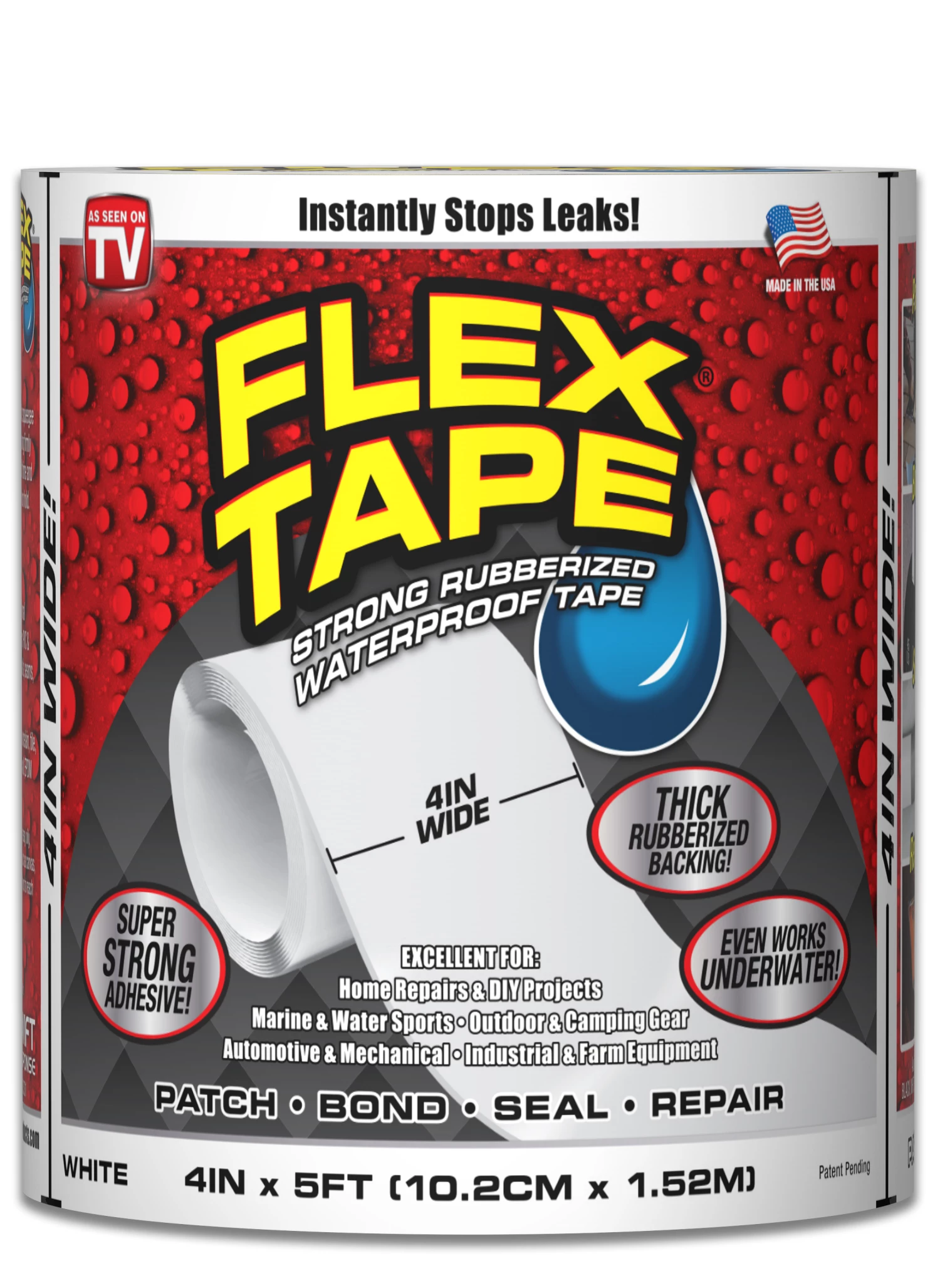 Flex Tape is a Super Strong Rubberized Waterproof Tape that creates a flexible rubberized water proof barrier. Flex Tape Instantly Seals Out Water and moisture can bond seal and patch virtually anything. It can even be applied under water and wet surfaces.