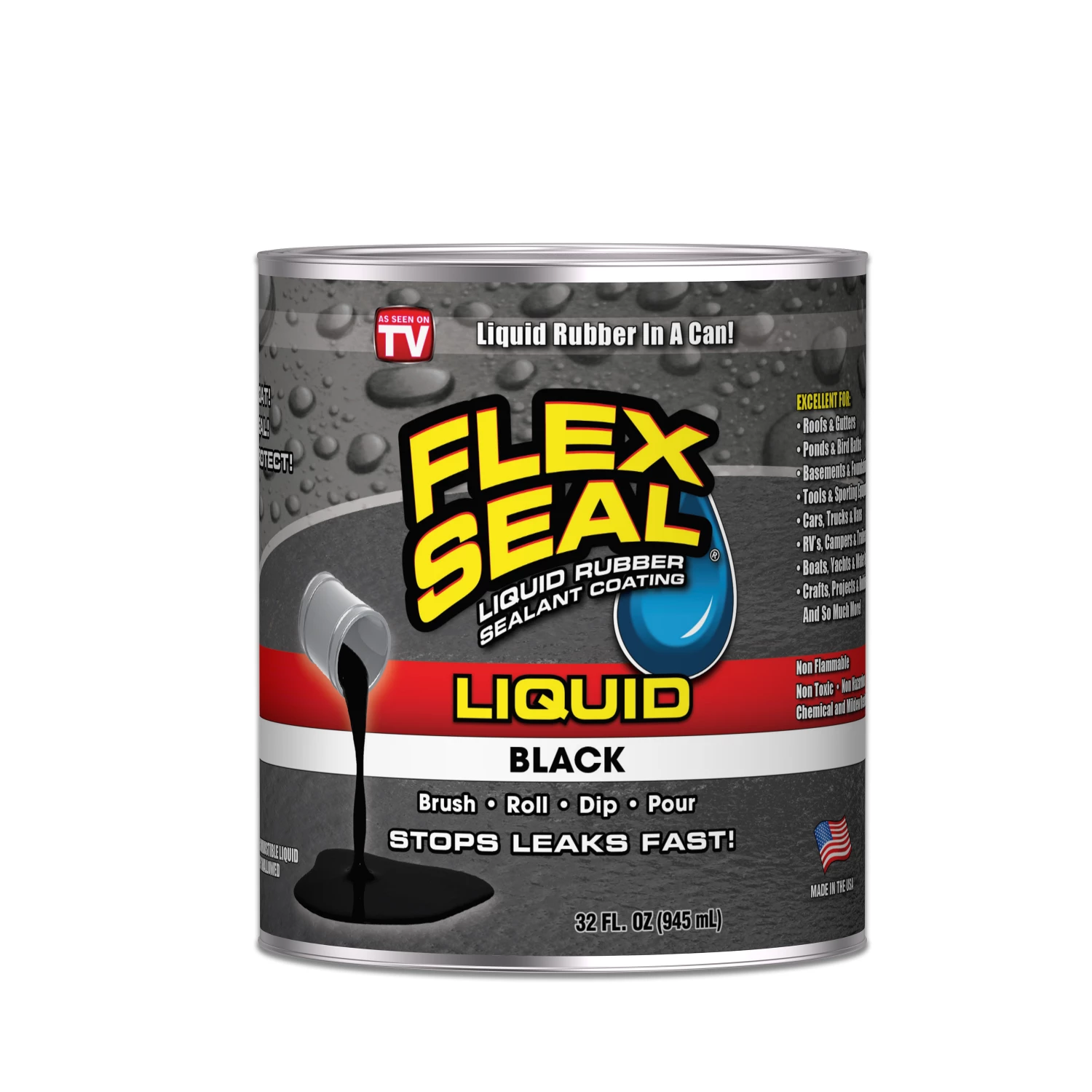 With Flex Seal Liquid, you can Coat, Seal, Protect and Stop Leaks Fast. It is Liquid Rubber in a can. Brush, Roll, Dip or Poor it, Flex Seal liquid is a thick Liquid that dries to a flexible Water Tight Rubberized coating., Creates a flexible rubber barrier that blocks out air, water and moisture. It is non toxic, non flamable, no harmful vapors, UV and mildew ressistant.