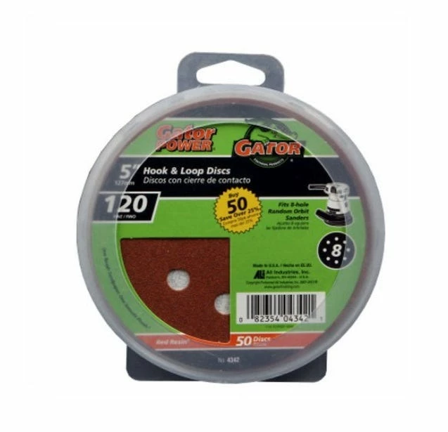 - Gator 50 Pack 5″ 8-Hole Fine 120 Grit Hook & Loop Sanding Disc
