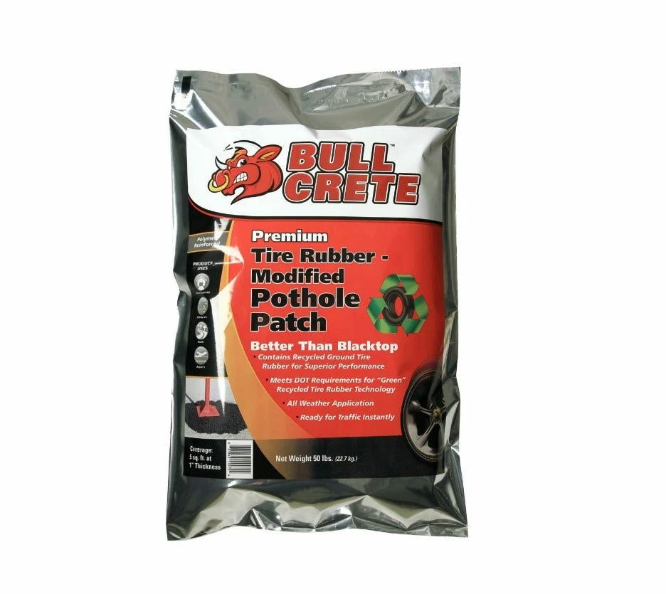 - Recycled ground tire rubber – BullCrete tire rubber modified pothole patch is an all-weather high performance pothole patch that forms a permanent repair for potholes, large cracks, utility cuts, and more.