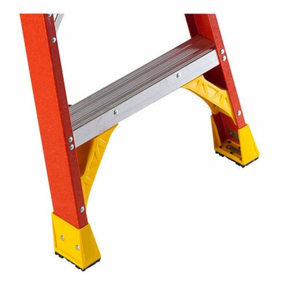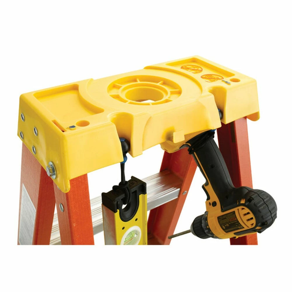 The 6210 Fiberglass 10 ft Step Stool is ideal for the homeowner or the professional. With a duty rating of 300 pounds, it features a HolsterTop with the Lock-In System to secure tools from falling while keeping them right at hand. The ladder offers a full set of rear horizontals and heavy duty internal spreaders. All steps are knee braced and the foot pads are riveted to the EDGE structure. The EDGE bracing system helps protect the rail from damage. Each TRACTION-TRED step is slip resistant and double riveted. Fiberglass rails are non-conductive for working near electricity.